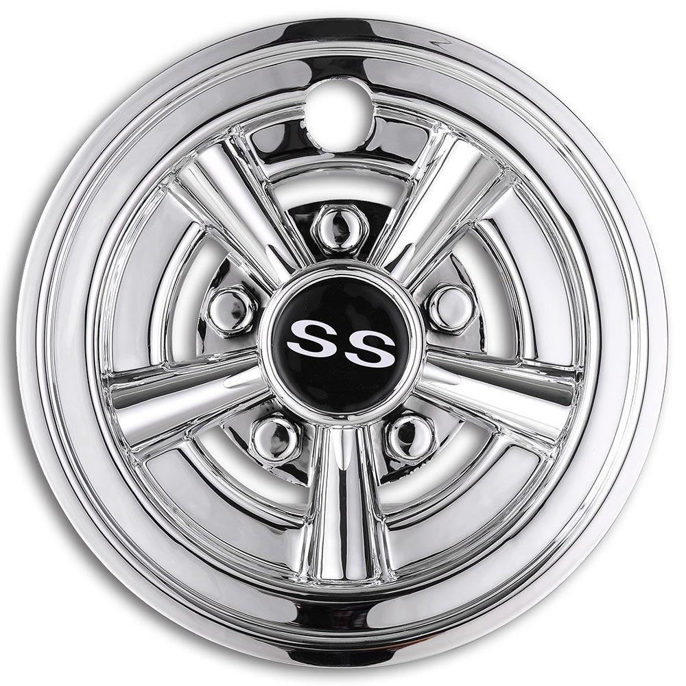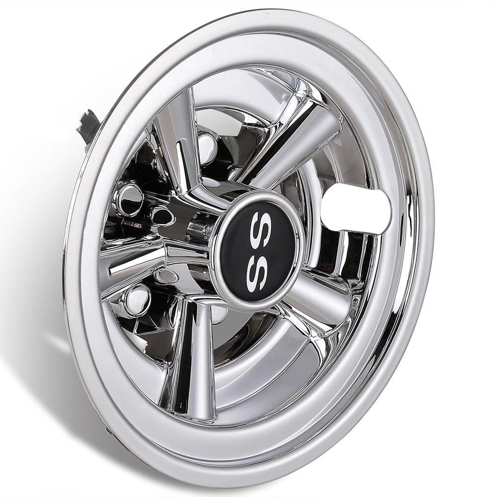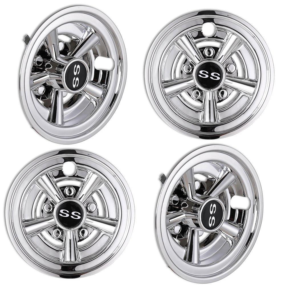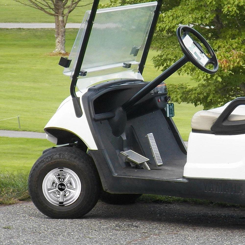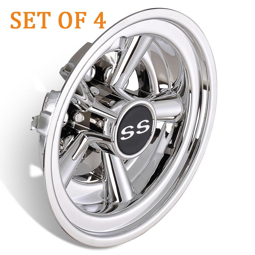 4Pcs golf cart wheel covers are widely used on most 8" golf cart wheels and they feature classic SS 5-spoke design with chrome finish for protecting the wheel hub and making your cart look cool.