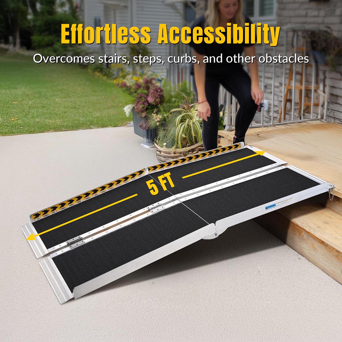 - Effortless Accessibility Anywhere - 5 ft Folding Wheelchair Ramp creates instant access for wheelchairs and scooters. Ideal solution for overcoming stairs, steps, curbs, and other obstacles, making any location accessible