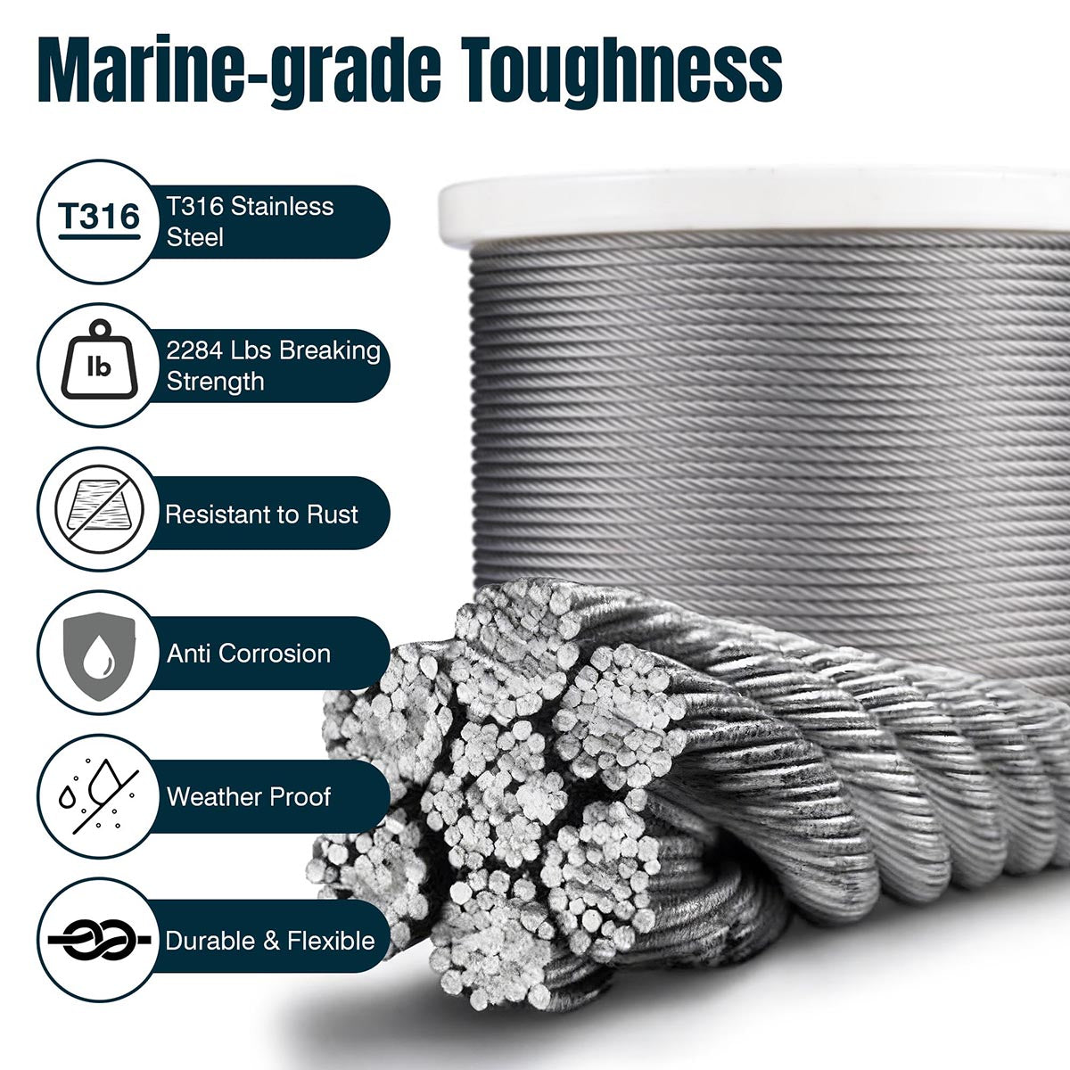 - Marine-Grade Toughness - 500ft Stainless Steel Cable is built with premium T316 marine-grade stainless steel, boasting superior resistance to rust, corrosion, and extreme weather. Provides unparalleled durability for residential or commercial railing projects even in coastal areas
