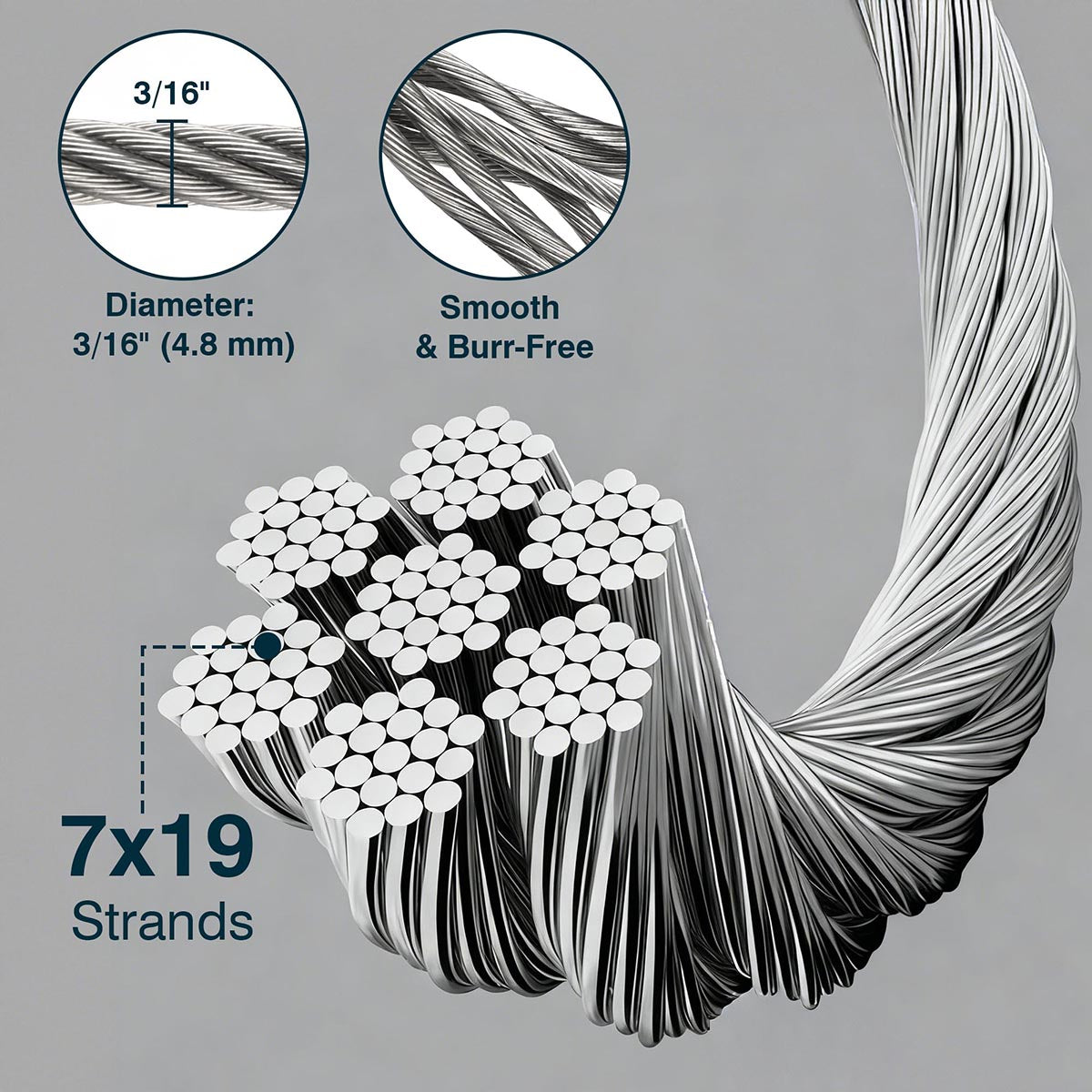 - Flexible 7x19 Structure - The 7x19 aircraft-grade strand construction offers superior flexibility and sturdiness, making it ideal for tensioning, securing, and any application requiring strength and maneuverability. The smooth surface with no burrs or sharp edges ensures safer use, and cuts cleanly without fraying for easy installation and a professional finish