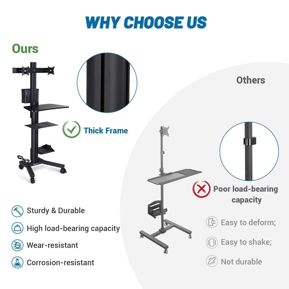 - 36" Crossbar: Enables horizontal mounting of two 32" monitors side by side on the cart (mobile computer cart features a 27 9/16" crossbar as standard) - VESA mount comes with an adjustable ball head for 45° monitor tilt & 360° swivel for a comfortable viewing angle.