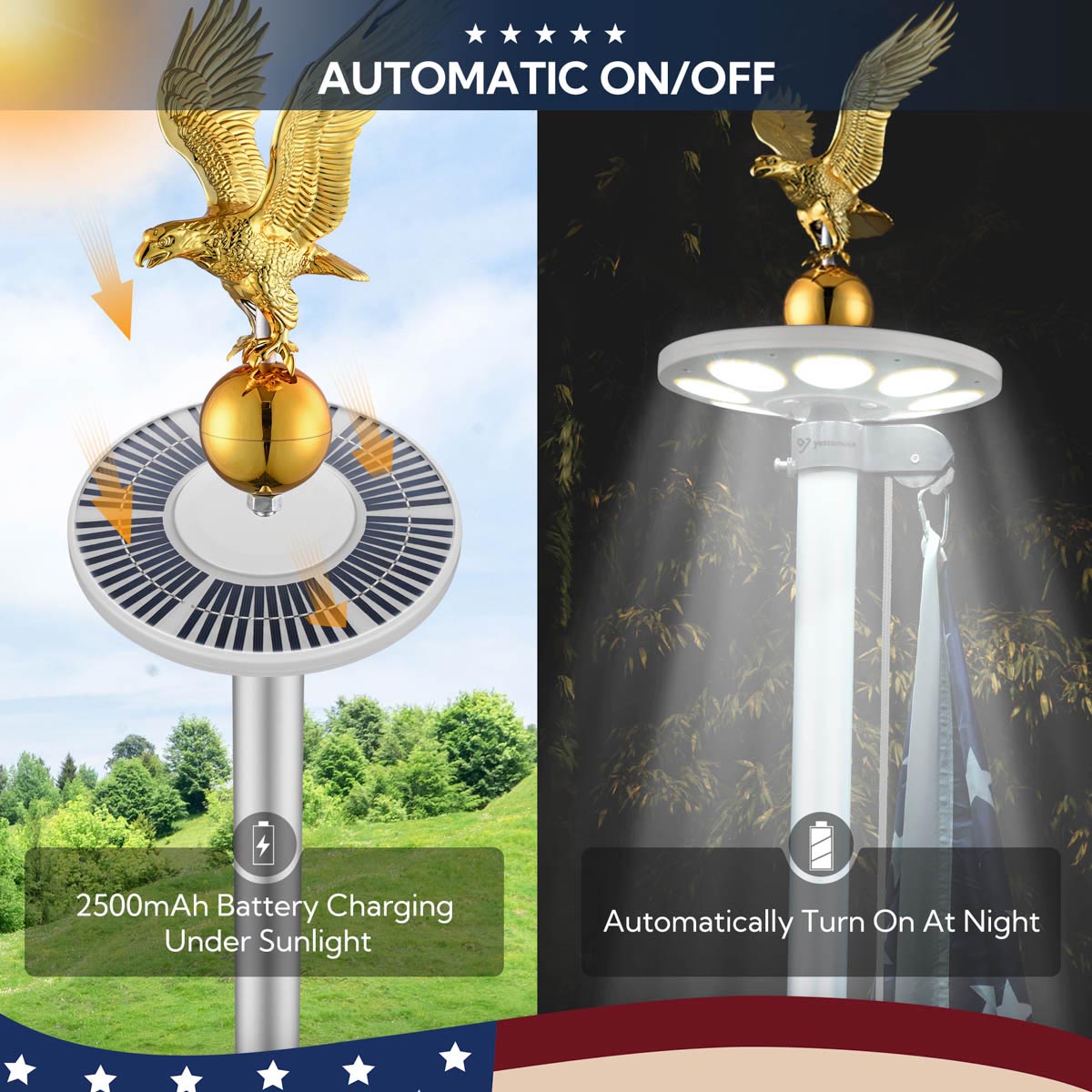- Solar Illumination for 24/7 Family Pride: The automatic solar light keeps your flag shining brightly from dusk till dawn. No complicated wiring or battery changes - just a constant, glowing symbol of your family's values, day and night.